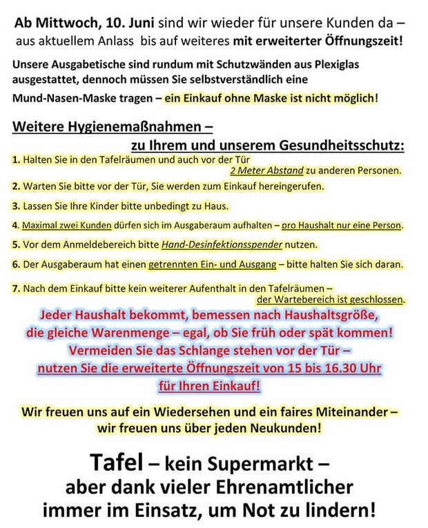 Der Kunde meldet sich vor jedem Einkauf im Büro an und bekommt dabei eine Nummer - diese werden ab ca. 15.15 Uhr nacheinander aufgerufen, so dass kein Gedränge und keine Hektik entstehen muss – auch der letzte Kunde soll möglichst so bedacht werden wie der erste – niemand muss also drängeln oder gar lange vor Beginn der Ausgabe vor geschlossener Tür „Schlange stehen“.